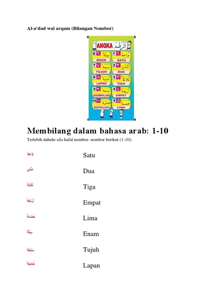 Sudahkah kamu tahu bagaimana penulisan dan penyebutan angka dalam bahasa arab? Dalam sistem penerapannya dinyatakan bahwa bilangan angka "123" . Ustazah hafsah memberi penerangan tentang;i. Nah, pelajari angka dalam bahasa arab berikut ini, yuk! Apa bahasa arab untuk angka 1, 2, 3, hingga 100?